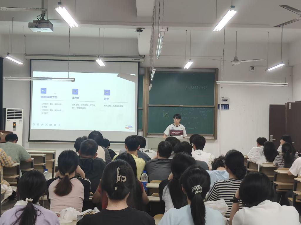 活动伊始,2023级辅导员张腾飞简要介绍了本次活动,强调了此次活动对于学生成长的重要意义,鼓励在场学生积极提问、主动交流,充分汲取优秀经验,为未来的学业深造做好准备。随后,3位学长学姐做经验分享,成功推免至上海大学结构工程专业的叶盼盼学姐分享了自己在保研期间所做的准备,她强调除了要保证自身优异的专业成绩之外,还需要积极参与科研竞赛及社会实践,不断提升综合素质。接下来成功考取河北大学控制工程专业的姚帅帅学长和上海理工大学管理科学与工程专业的江振洋学长则从跨专业考研的方式、考研院校专业的选取、院校调剂等方面为同学们深入全面讲解,同时以自身备考经验,提供合适的备考方案和时间管理方案。在互动问答环节,同学们踊跃提问,就跨专业考研的难度、如何进行高效的复习等问题与学长学姐们深入交流,学长学姐们耐心细致地解答,并结合自身经历给出个性化建议,现场不时响起热烈的掌声。