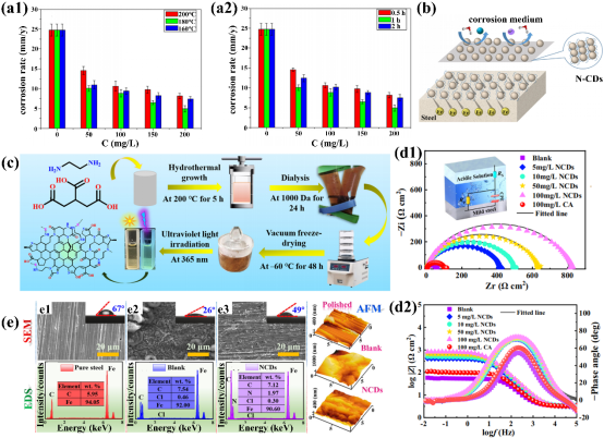 在碳中和的背景下,建筑、交通、能源等各行各业都在寻求减少碳排放途径。然而,腐蚀问题往往会导致设备性能下降、能源消耗增加和环境污染加剧,这与碳中和的目标相悖。因此,加强腐蚀防护工作不仅有助于减少经济损失和安全隐患,还有助于推动碳中和目标的实现。碳点作为一种新型的纳米材料,在腐蚀防护领域展现出卓越的先进性。其纳米尺寸效应赋予其极高的表面活性,能够精准附着于金属表面形成致密防护层,有效隔绝腐蚀介质。同时,碳点独特的物理化学性质,如优异的化学稳定性和电化学惰性,使其在复杂腐蚀环境中仍能保持防护效能。此外,碳点还可通过功能化修饰进一步增强其防腐性能,实现智能响应与自修复功能,为腐蚀防护技术带来革命性突破。